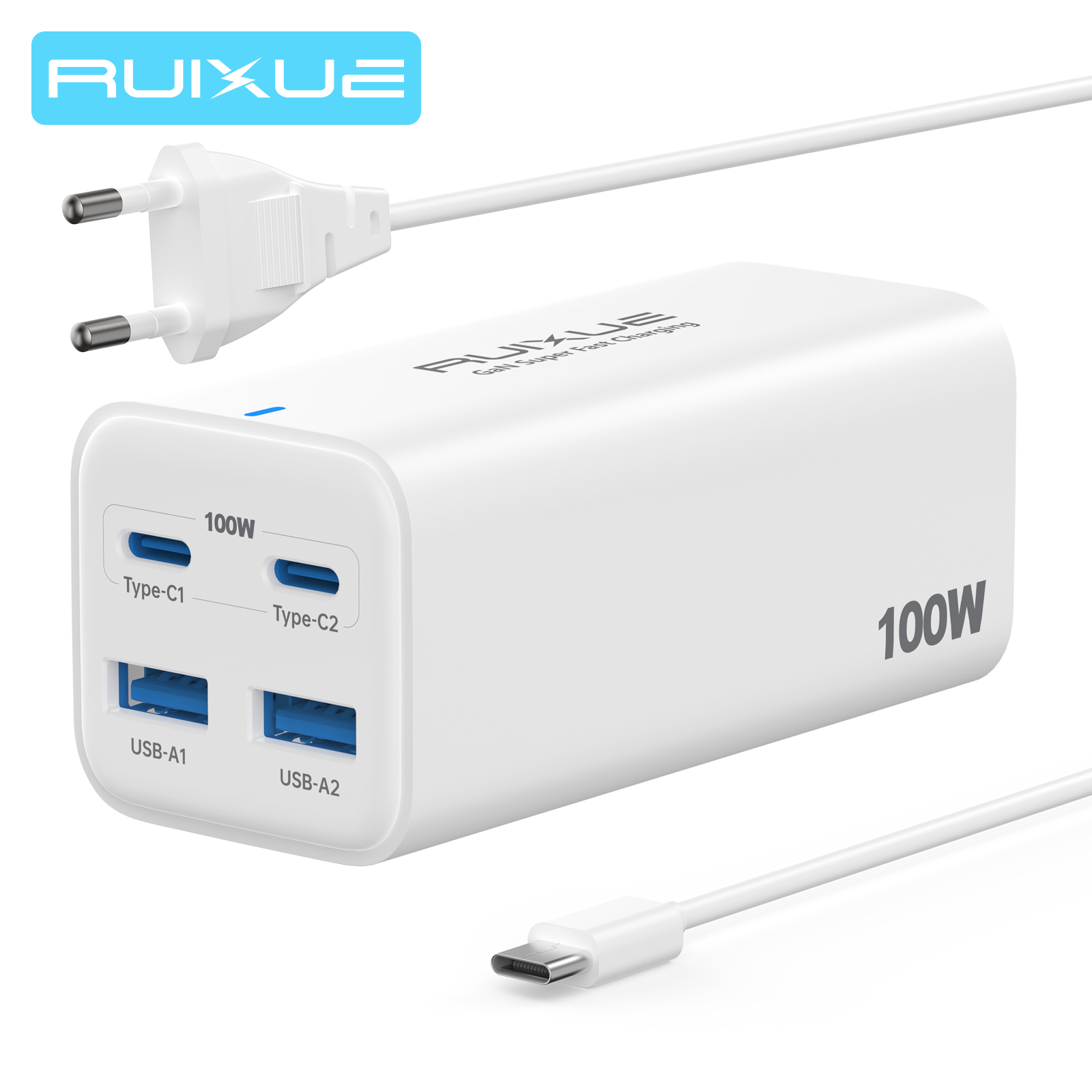 RUIXUE 서설 100W GaN 2C2A 4 포트 멀티 고속 충전기, 1.5m 전원코드 + 1m C 타입 충전케이블, PD3.0 QC4.0 PPS 충전 지원, 100W 화이트, 1개